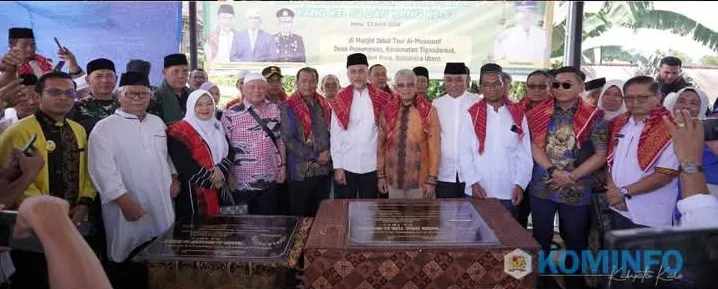 PERESMIAN : Bupati Karo, Antonius Ginting, meresmikan Masjid Jabal Tsur Al Musannif sekaligus sarana air bersih di Desa Penampen, Kecamatan Tiganderket, Rabu (23/4). Peresmian itu ditandai dengan prasasti bersama tokoh-tokoh penting, antara lain Dr. H. Musa Rajekshah, M.Hum., Mayjen TNI (Purn) Musa Bangun. (Foto/Dok/Dinas Kominfo Karo).